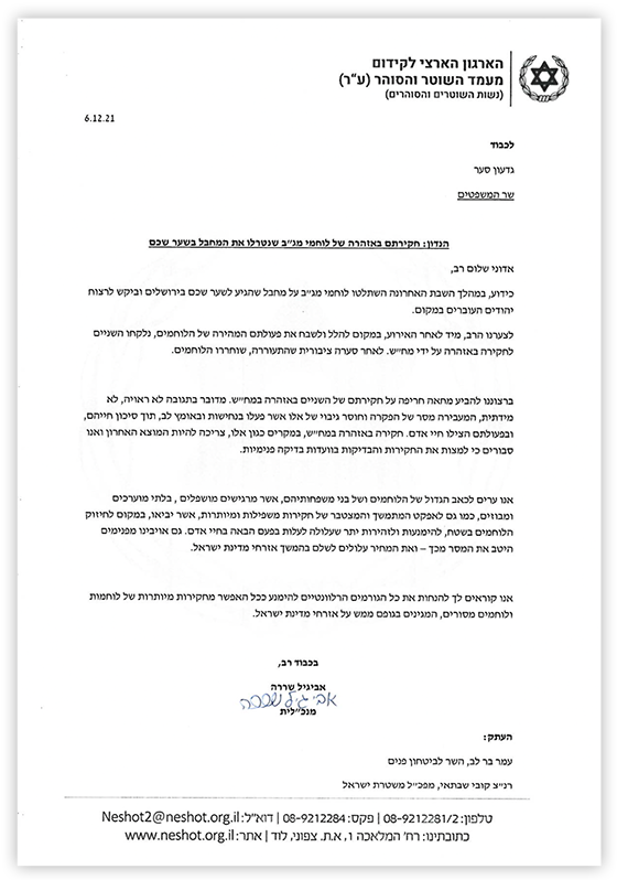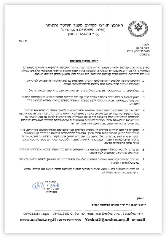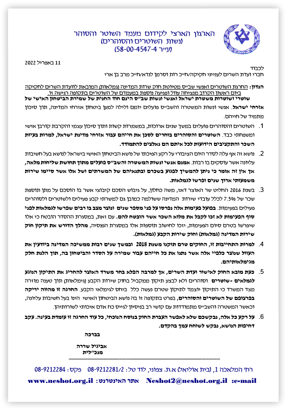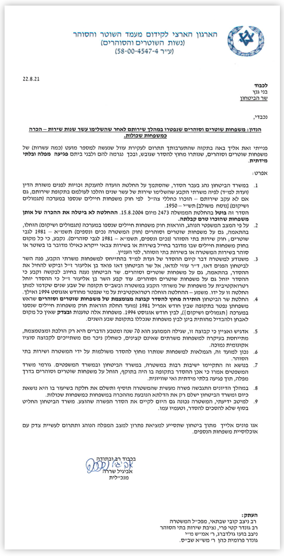 ארגון נשות השוטרים והסוהרים פנה במכתב בנושא הן לשר הביטחון, הן לסגן שר הביטחון ובהמשך לתשובתם, גם לשר לבט"פ