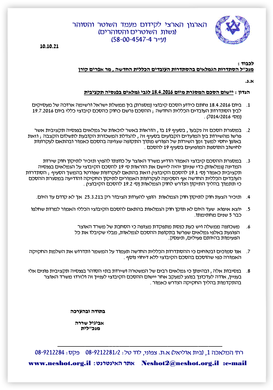 פנינו במכתבים הן למנכ"ל ההסתדרות והן לחברי ועדת שרים לחקיקה וכן ליו"ר הוועדה לביטחון פנים בכנסת ולח"כ רות וסרמן לנדה.